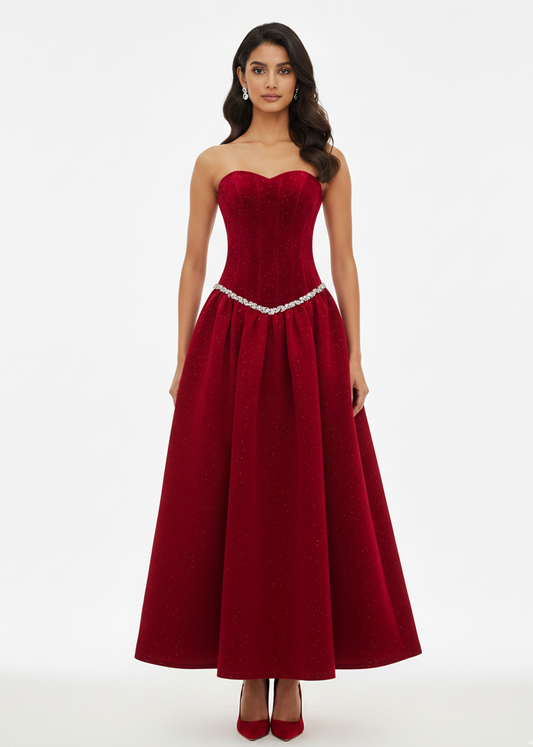 Velvet Ember Bustier Midi Dress